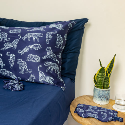 The MYRN Silk Signature Sleep Sets are a four piece collection which includes a single printed silk pillowcase, complimentary matching silk scrunchie and silk eye mask, with a matching quilted silk travel case, all packaged for a reduced cost versus buying individually. Sleep sets are presented in two MYRN Silk branded boxes to ensure you can easily store and travel with your silk products. Scrunchies are also available as a 3 piece gift set in our Signature MYRN leopard print colours.
